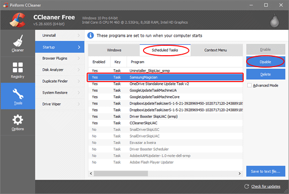 d) Alguns programas usam o agendamento de tarefas do Windows para serem iniciados automaticamente com o Windows. Portanto, clique na guia “Scheduled tasks” e desabilite também os programas desejados.