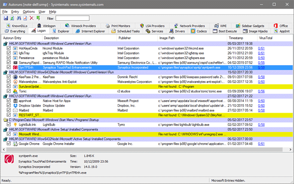 b) Na guia “Everything” ele vai exibir tudo o que é inicializado com o Windows. Porém, navegar pelas guias pode ser mais simples. Eu recomendo que você verifique as guias “Logon“, “Schedule Tasks” e “Services“.