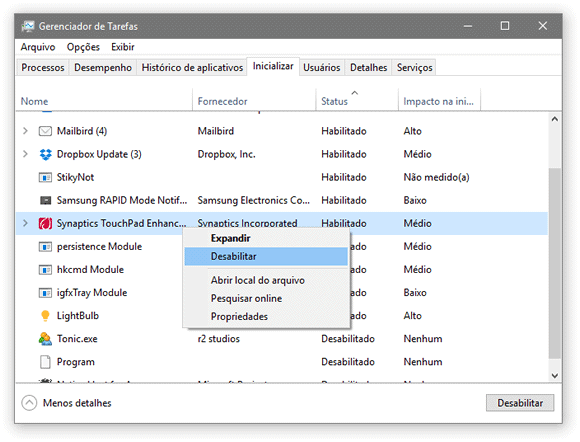 c) Pronto, agora basta você clicar com o botão direito nos programas que deseja remover da inicialização e escolher a opção “Desabilitar“, para impedir que o programa seja iniciado automaticamente com o sistema.