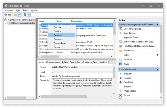 b) Clique em “Biblioteca do Agendador de Tarefas” para ver a lista de tarefas agendadas. Para desabilitar uma tarefa, tudo o que você precisa fazer é clicar com o botão direito nela e selecionar a opção “Desativar“.