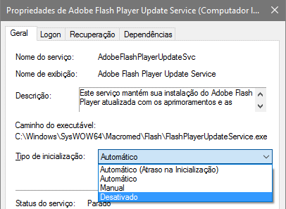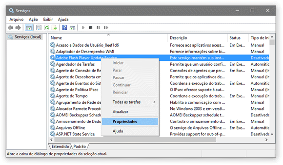 b) Para desabilitar um serviço, clique com o botão direito nele e selecione a opção “Propriedades“.