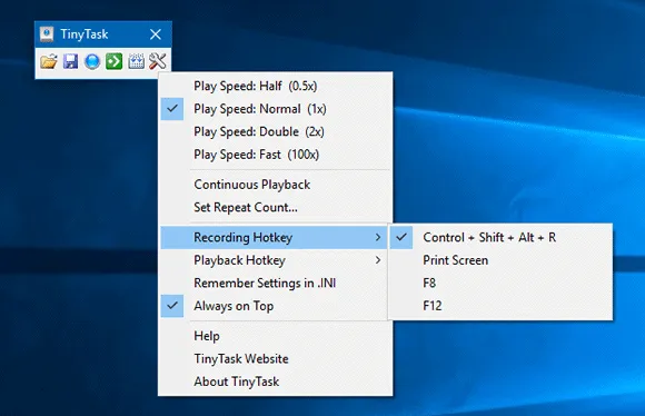 Nas opções do TinyTask você também pode alterar as teclas de atalho, assim como definir a velocidade de reprodução da ação, o que pode ser útil por exemplo para repetir mais rapidamente a ação que você gravou.