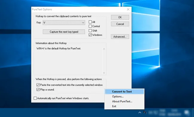 Para configurar a tecla de atalho do PureText, clique com o botão direito no ícone da bandeja do sistema e depois “Options” no menu. A tecla de atalho padrão é “WIN + V”, entretanto você pode usar qualquer tecla.