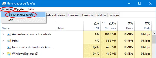 2. Clique em “Mais Detalhes”, se necessário, e depois no menu “Arquivo > Executar nova tarefa“.