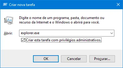 3. Digite explorer.exe, marque a caixa Criar esta tarefa com privilégios administrativos e clique em OK.