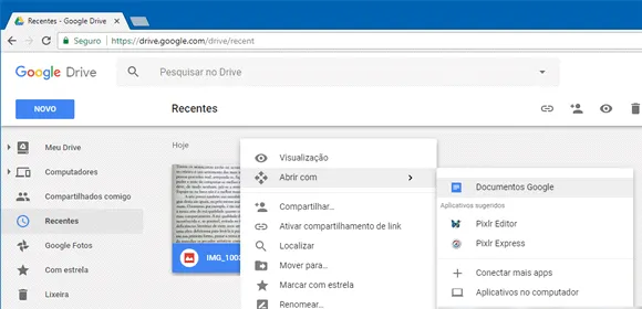 3. Clique com o botão direito na imagem enviada e selecione “Abrir com > Documentos Google“.