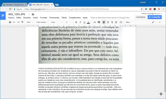 4. Uma vez feito isso, o Google Docs irá extrair automaticamente o texto da imagem e, em seguida irá criar um novo documento editável no Google Docs para você, com a imagem digitalizada e o texto extraído dela.