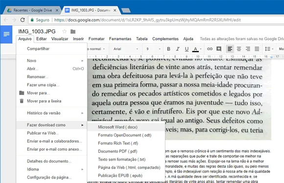 5. Você pode simplesmente copiar o texto e colá-lo em um outro programa, como o Word, ou então clicar no menu Arquivo > Fazer download como e baixar o documento em formatos como DOCX, ODT, RTF e TXT.