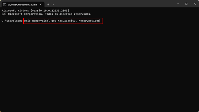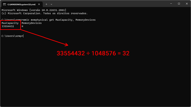 Os usuários do Windows podem determinar a capacidade máxima de RAM suportada a partir do prompt de comando. O valor é exibido em quilobytes, mas para convertê-lo para gigabytes, basta dividir por 1.048.576.