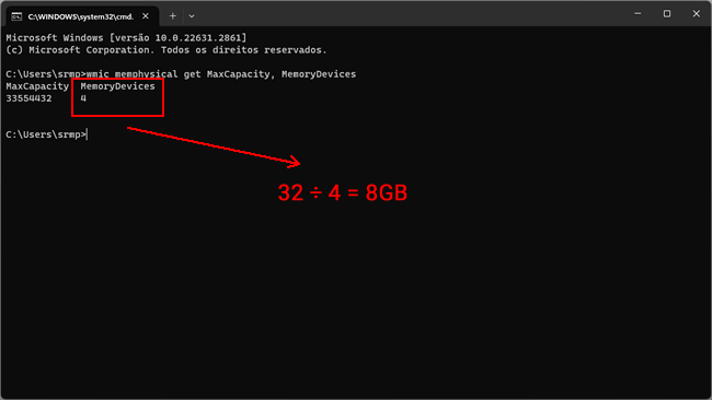 3. O comando também mostra que a placa-mãe possui dois slots de memória. Isso fornece rapidamente a capacidade máxima de memória RAM suporta por slot. Basta dividir a capacidade máxima pelo número de slots. No exemplo acima seria 32 ÷ 4 = 8GB, logo você pode instalar até 4 pentes de memória de 8GB cada.