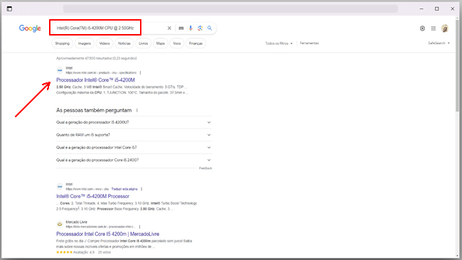 3. Abra o Google em seu navegador e pesquise pelo modelo do processador que você copiou. Por exemplo, pesquise por Intel(R) Core(TM) i5-4200M CPU @ 2.50GHz, e remova o restante das informações copiadas.