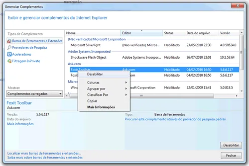 O Internet Explorer oferece um gerenciador de complementos, que lhe permite desabilitar as barras de ferramentas instaladas no navegador, fazendo com que elas não sejam mais exibidas.