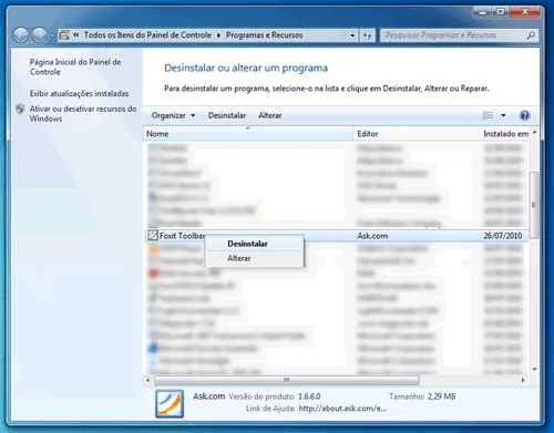 Algumas barras de ferramentas do Internet Explorer são exibidas no utilitário de desinstalação de programas do Windows, permitindo assim que você as desinstale facilmente.