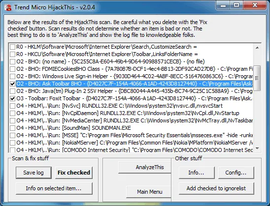 Remover barras de ferramentas do Internet Explorer usando o Hijack This.