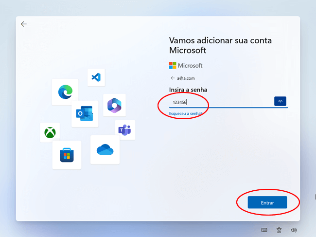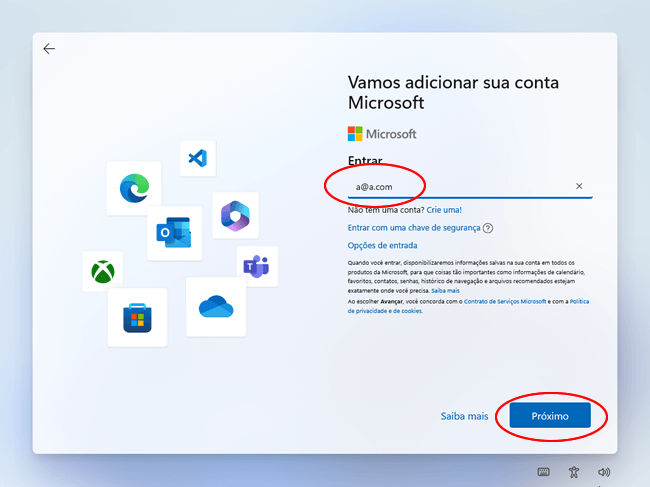 1. Prossiga normalmente com a instalação do Windows 11 e ao chegar na tela que ele pede para você entrar com uma conta da Microsoft para prosseguir, digite o endereço de e-mail a@a.com e clique em “Próximo”.