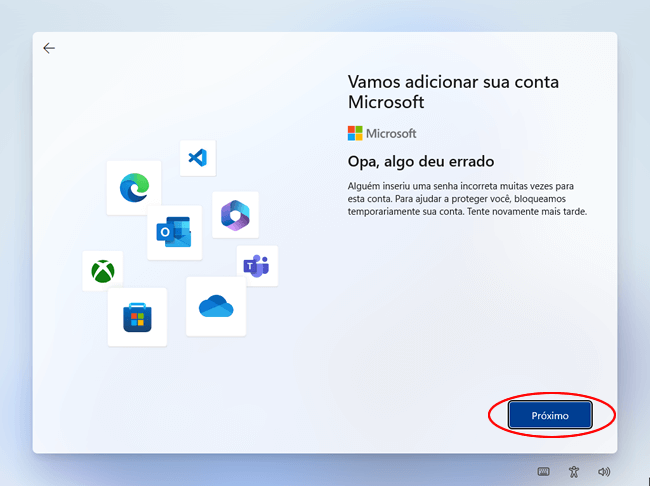 3. Ao fazer isso, será exibida uma mensagem de erro da Microsoft começando com “Opa, algo deu errado”. Aqui a Microsoft avisa que bloqueou temporariamente a conta. Não se preocupe, esse é um passo normal.