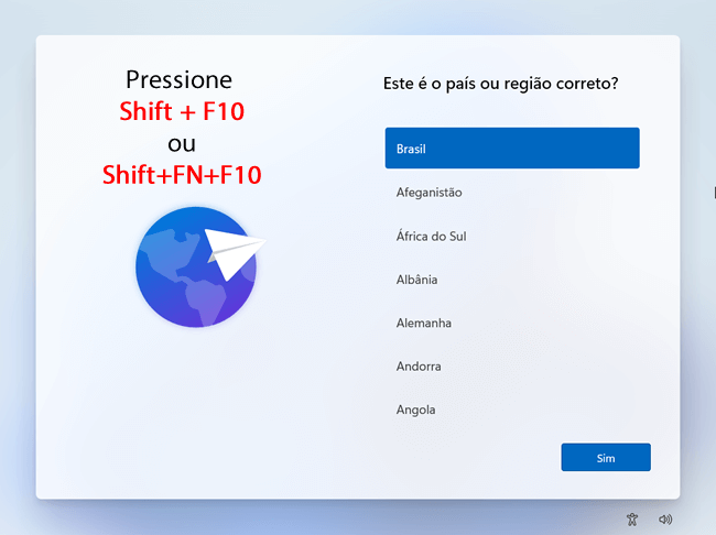 1. Siga o processo de instalação do Windows 11 até chegar na tela que pede para você selecionar seu país. Em seguida, pressione a combinação de teclas “Shift + F10” para abrir o Prompt de Comando do Windows.