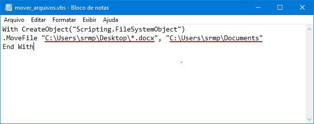 2. Copie o script, cole-o no bloco de notas e substitua o caminho C:\Soft1 e C:\Soft2. Para mover arquivos específicos, substitua o *.* por *.extensão. Por exemplo, para mover apenas os arquivos DOCX, use *.docx.