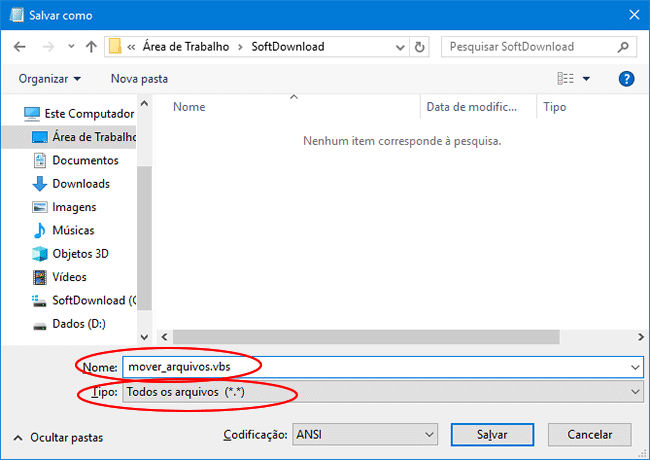 3. Clique no menu “Arquivo >Salvar“, selecione Todos os arquivos no campo “Tipo” e salve o arquivo com a extensão .vbs. Se estiver movendo arquivos por tipo, crie scripts para outras extensões que deseja mover.
