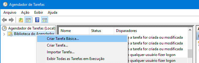 2. Clique com o botão direito em “Biblioteca do Agendador de Tarefas” e selecione “Criar Tarefa Básica”