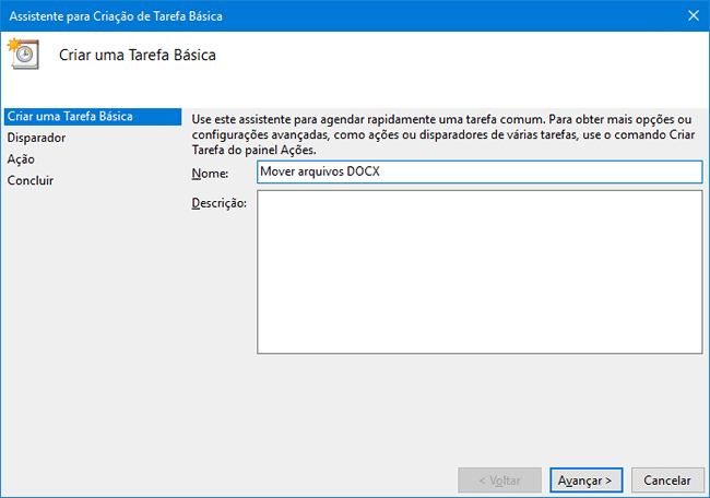 3. Digite um nome para a tarefa, como por exemplo, “Mover arquivos DOCX” e clique em “Avançar“.