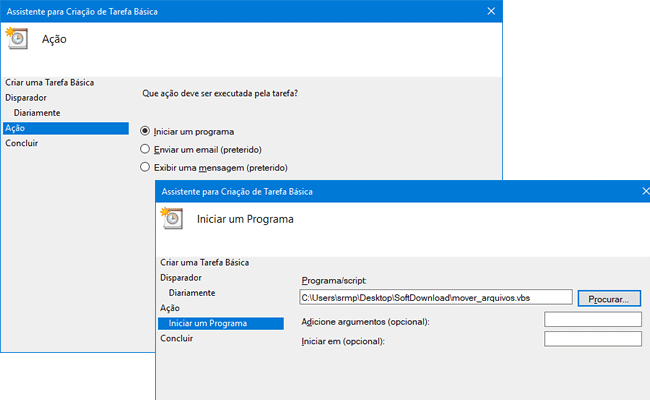 5. Marque a opção “Iniciar um Programa” e na tela seguinte clique em “Procurar” e selecione o script .vbs.