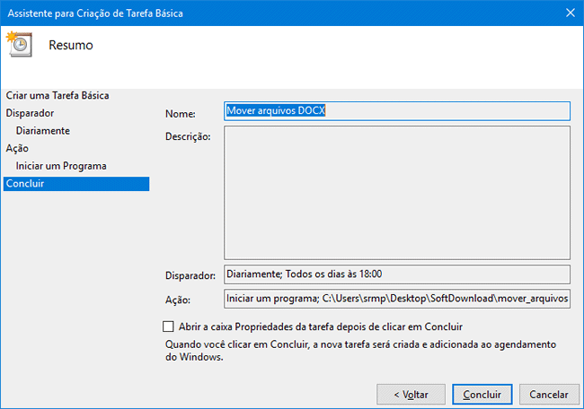 6. Por fim, clique em “Concluir” para terminar a criação da tarefa agendada.