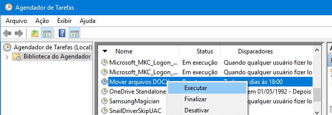 7. Pronto, agora ele será executado automaticamente no horário agendado. Se quiser testar o script, clique com o botão direito nele e selecione “Executar” para que a tarefa agendada seja executada imediatamente.