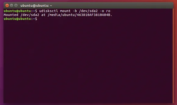 - Digite udisksctl mount -b /dev/sda2 -o ro e pressione ENTER