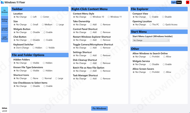 A interface principal do programa possui uma barra lateral que lhe permite acessar os diferentes grupos de ajustes. Os quatro grupos são “Fix Windows”, “Windows Settings”, “Uninstall MS Bloat” e “Install Software”.