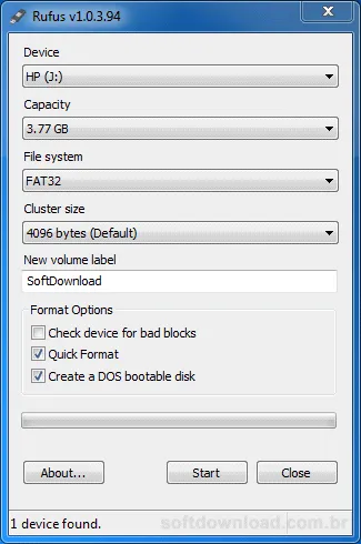 Criar um pendrive inicializável do DOS com o Rufus é muito fácil. Basta plugar o pendrive no computador, executar o “Rufus.exe” e clicar no botão “Start” para iniciar a criação do pendrive inicializável do MS-DOS.