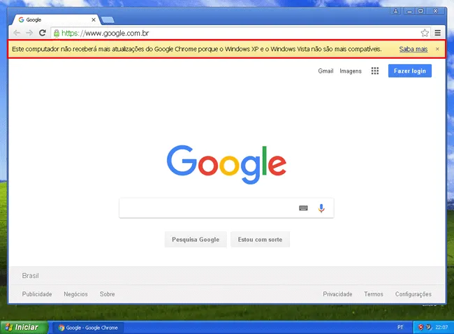 2. Ao abrir o Google Chrome, ele irá exibir a mensagem que o computador não receberá mais atualizações do Chrome porque o XP e o Vista não são mais compatíveis. Entretanto, é possível desativar a mensagem.