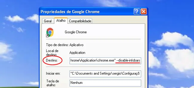 O final do caminho no campo Destino ficará assim: Chrome\Application\chrome.exe” –disable-infobars