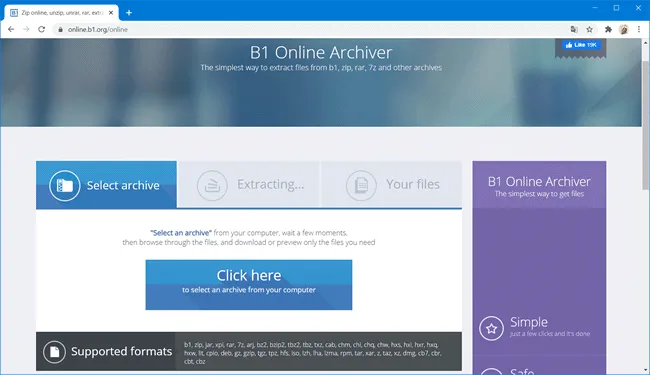 B1 Online Archiver é um serviço online de extração de arquivos compactados muito simples de usar. Para começar, acesse o site, clique em “Click here” e selecione o arquivo em seu computador que deseja extrair.