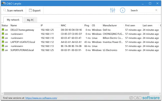O O&O Lanytix é um programa portátil, portanto, basta baixar o programa e executá-lo. Em seguida, clique no botão “Scan network” para executar uma verificação na rede local em que o computador está conectado.