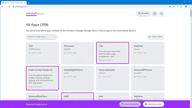 Acesse o site do Winstall e clique no nome dos programas para selecioná-los. Os programas selecionados são exibidos com a borda roxa. Você também pode usar a pesquisa para encontrar programas específicos.