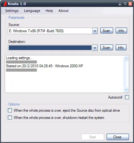 Koala é portátil e muito fácil de usar. Insira o disco de instalação do Windows no drive de CD/DVD e clique em “Scan” no item “Source” para a ferramenta ler a informações do sistema operacional a partir do DVD do Windows.