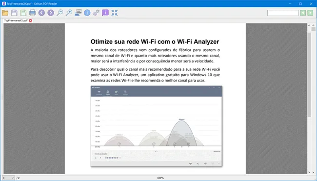 Ao abrir um arquivo PDF no Xelitan PDF Reader, a barra de ferramentas oferece os recursos padrões de um leitor PDF, como opção para navegar entre as páginas, dar zoom, ajustar ao tamanho da janela e pesquisar.