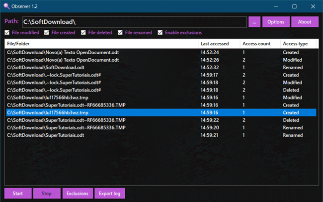 As alterações detectadas são exibidas na janela do programa, com informações como caminho e nome do arquivo, data do último acesso, número de acessos e o tipo (criação, modificação, renomeação e exclusão).