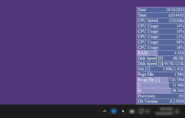 Uma vez executado, ele exibe um pequeno quadro no canto inferior direito da tela com informações como a data e hora atuais, velocidade e uso da CPU, memória RAM usada, tamanho ocupado dos discos locais, etc.