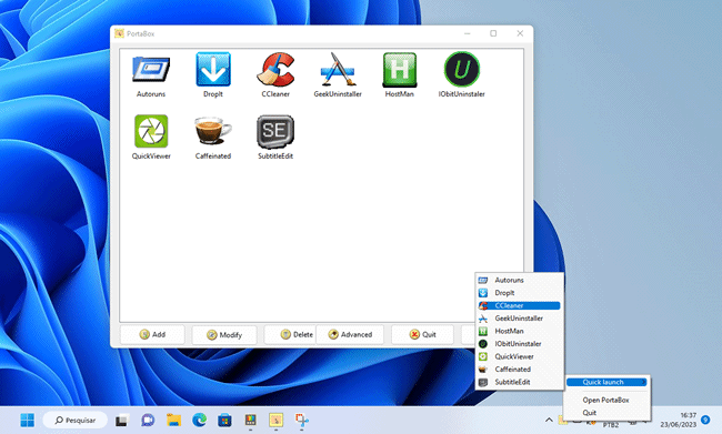 Como o próprio nome sugere, o acesso rápido (Quick Launch), permite que você execute rapidamente seus programas portáteis, clicando com o botão direito no ícone do PortaBox adicionado na bandeja do sistema.