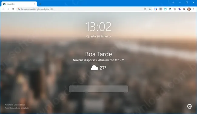 A imagem de fundo é dinâmica, isso significa que ela é alterada periodicamente com base em coleções de imagens do site Unsplash, entretanto, você também pode usar suas próprias fotos como imagem de fundo.
