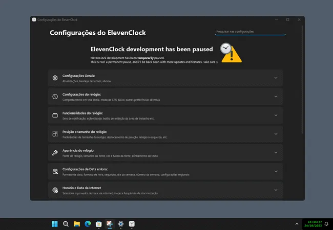 Todas as opções podem ser reajustadas novamente mais tarde, a partir das configurações do ElevenClock, que você pode acessar clicando com o botão direito no ícone do relógio na barra de tarefas do Windows 11.
