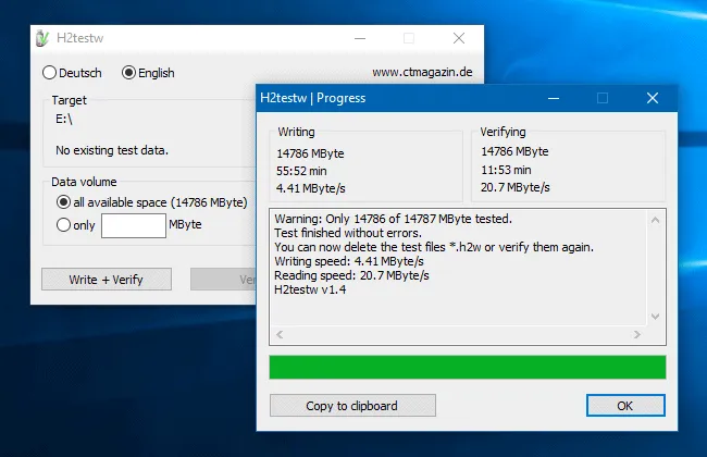 Uma vez feito isso o H2testw irá preencher o espaço de armazenamento do pendrive com dados de teste e em seguida, irá verificar a integridade dos dados para detectar possíveis setores defeituosos no dispositivo.