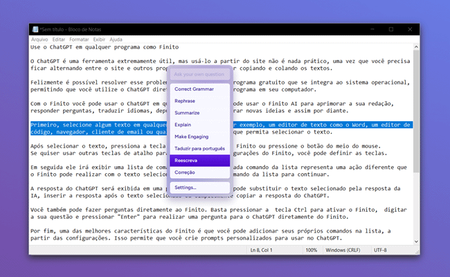 Felizmente é possível resolver esse problema com o Finito, um programa gratuito que se integra ao sistema operacional, permitindo que você utilize o ChatGPT diretamente de qualquer programa em seu computador.