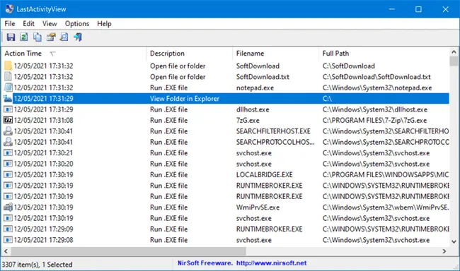 O LastActivityView é programa portátil, basta extrair o arquivo ZIP e executar o arquivo.exe. Ao executá-lo, ele lista toda a atividade com informações como data, descrição, nome do arquivo, caminho completo, etc.