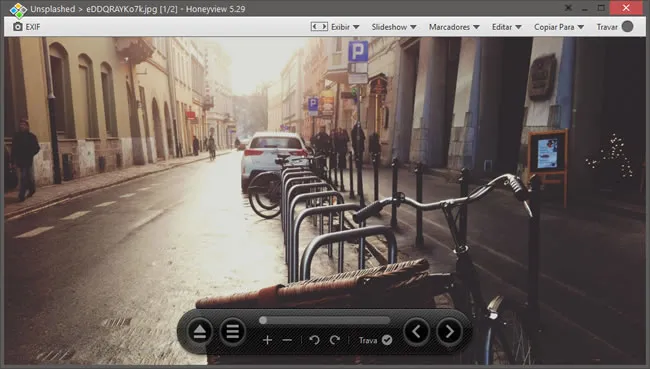 O programa oferece todos os recursos que se espera de um visualizador de imagens. Por exemplo, a partir do menu “Exibir” você pode visualizar a imagem no tamanho original, ajustar a imagem a janela, largura, etc.