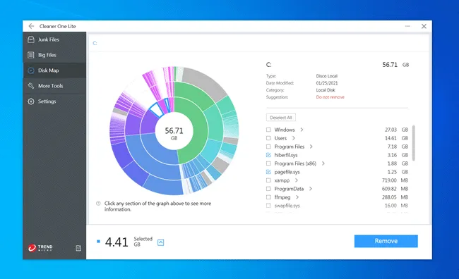 Cada seção do gráfico representa uma pasta ou um arquivo. Você pode clicar nas seções para visualizar o gráfico da pasta e, em seguida, marcar os arquivos que deseja remover para liberar mais espaço em disco.